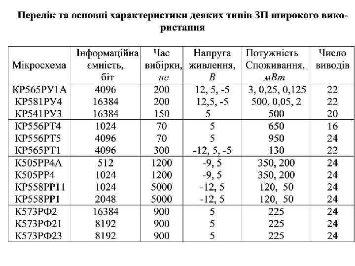 До першої групи належать мікросхеми ОЗП. Мікросхеми другої групи – це ПЗП з одноразовим електричним програмуванням. До третьої та четвертої груп зібрані відповідно ППЗП з багаторазовим електричним перепрограмуванням та з електричним записом і знищенням інформації за допомогою ультрафіолетового променя. Остання група ППЗП має досить мале число можливого перезапису (10) за порівнянням з мікросхемами третьої групи (10000). Однак час зберігання інформації для мікросхем четвертої групи значно більший (10000 год. ), ніж для ППЗП третьої групи (3000 год. ).