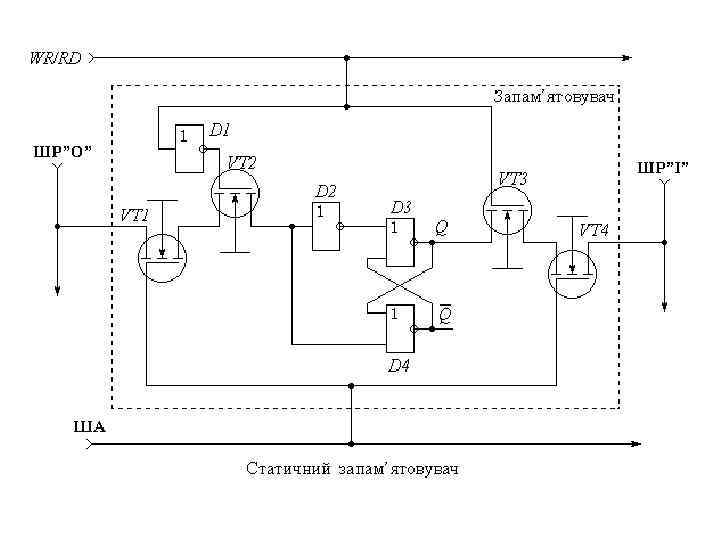 • Транзистори VT 1 та VT 4 утворюють двонаправлені ключі звернення по шині адреси ША до запам’ятовувача. • При ША = 0 (транзистори VT 1 та VT 4 закриті) запам’ятовувач зберігає інформацію. • Стан шини адреси ША = 1 активізує запам’ятовувач, під’єднуючи вхід запису до розрядної шини вхідних даних ШР ”О” та вихід зчитування до розрядної шини вихідних даних ШР “І”. • Транзистори VT 2 та VT 3 утворюють двонаправлені ключі вводу/виводу (запису або зчитування) даних, тобто звернення по шині WR/RD. • При низькому рівні на шині WR/RD логічний нуль, через що транзистор VT 3 закритий і зчитування неможливе. Завдяки інвертору D 2, транзистор VT 2 відкритий і під’єднує через VT 1 (при ША = 1) вхід запису до розрядної шини вхідних даних ШР ”О”.