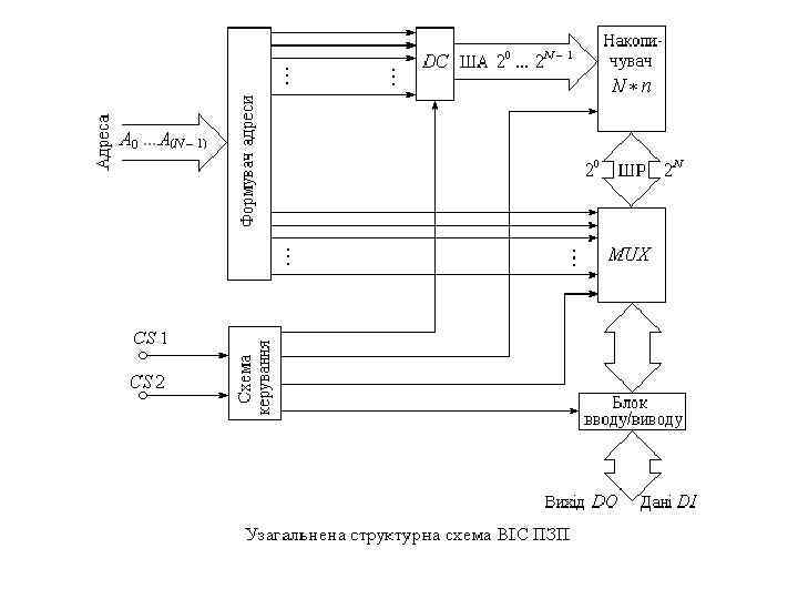 Для запису слова у запам’ятовувач за адресою хі, уj на вході адресних дешифраторів ШАY і ШАХ подаються відповідні адреси. Інформаційне двійкове слово надходить на спільні розрядні шини ШР через пристрій запису, а зчитування записаного слова здійснюється через пристрій зчитування. Структурна схема має два керуючих входи: запис/зчитування та додатковий – . Керуючий вхід , що носить назву “вибір мікросхеми” – це вхід дозволу проходження сигналу. Вхідні схеми ВІС ОЗП – це формувачі на логічних елементах, що забезпечують спряження накопичувача з вхідними зовнішніми пристроями за струмом та напругою. Вихідні каскади ВІС ОЗП – це логічні елементи з відкритим колектором або тристанові буфери, які забезпечують каскадування ВІС у системах з шинною організацією передавання даних.