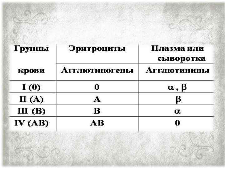 Каждая группа крови отличается серологическими свойствами. Определяются эти свойства агглютиногенами и агглютининами. В основу такого разделения положена система АВО. А и В являются антигенами, по характеру строения относятся к классу гликопротеидов. В 88% случаев антиген А обладает большей антигенной силой и обозначается А 1. В 12% случаев встречается антиген А 2, слабо реагирующий с антисывороткой. Сильный антиген A 1 выявляется быстрой реакцией и дает крупнозернистую агглютинацию, слабый антиген А 2 обладает противоположными свойствами (медленной реакцией и мелкозернистой агглютинацией). На основании подобного разделения выявлено, что группа крови OI встречается у 32 % людей, АН — у 40 %, ВIII — у 20 % и ABIV — у 8 %. Помимо антигенов А и В, находящихся в эритроцитах, в плазме крови имеются агглютинины альфа и бета.