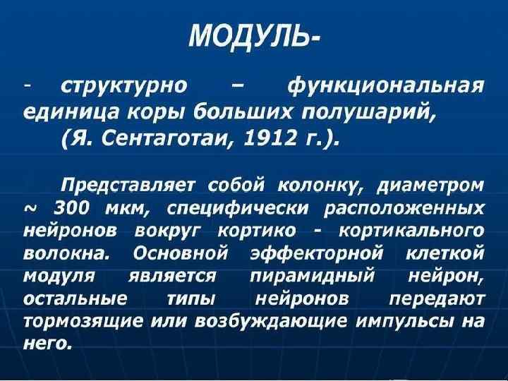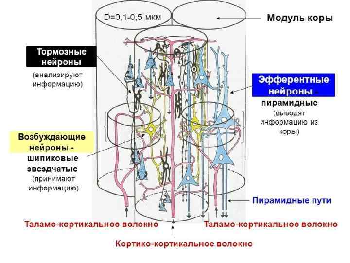 МОДУЛЬ • Возбуждающие нейроны: • 1 - шипиковые звездчатые фокального типа (образуют возбуждающие синапсы на апикальном дендрите пирамидных нейронов и на отростках клеток с двойным букетом дендритов); • 2 - шипиковые звездчатые диффузного типа (формируют синапсы на боковых и базальных дендритах пирамид). • Тормозящие нейроны: • 1 – клетки с аксональной кисточкой (образуют тормозящие синапсы на горизонтальных ветвлениях кортико - кортикальных волокон); • 2 – корзинчатые нейроны - подразделяются на малые корзинчатые нейроны (образуют синапсы на пирамидах II, III, V слоев своего модуля) и на большие корзинчатые нейроны (образуют синапсы на пирамидах соседних модулей); • 3 – аксональные нейроны (образуют синапсы на аксонах пирамидных нейронов II и III слоев); • 4 - клетки с двойным букетом дендритов (формируют тормозящие синапсы на всех тормозных нейронах, таким образом оказывая вторично – возбуждающее действие).