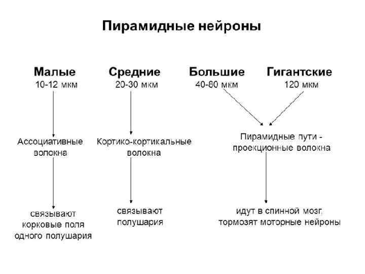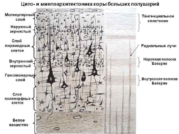 ЦИТОАРХИТЕКТОНИКА КОРЫ БОЛЬШИХ ПОЛУШАРИЙ • • • • I МОЛЕКУЛЯРНЫЙ СЛОЙ: - отростки нейронов нижележащих слоев; - единичные мелкие пирамидные и веретеновидные нейроны. II НАРУЖНЫЙ ЗЕРНИСТЫЙ СЛОЙ: - мелкие пирамидные нейроны; - клетки-зерна; - звездчатые нейроны. III ПИРАМИДНЫЙ СЛОЙ: - мелкие и средние пирамидные нейроны. IV ВНУТРЕННИЙ ЗЕРНИСТЫЙ СЛОЙ: - звездчатые нейроны; - мелкие пирамидные нейроны. V ГАНГЛИОНАРНЫЙ СЛОЙ (СЛОЙ ГИГАНТСКИХ ПИРАМИД БЕЦА): - гигантские пирамидные нейроны; - небольшое количество звездчатых нейронов VI СЛОЙ ПОЛИМОРФНЫХ КЛЕТОК: - нейроны различной величины и формы перикариона.