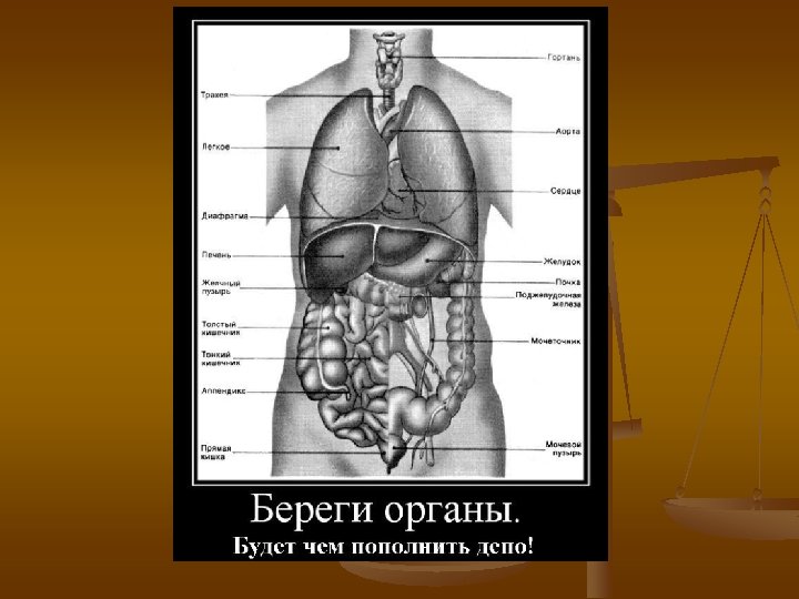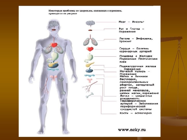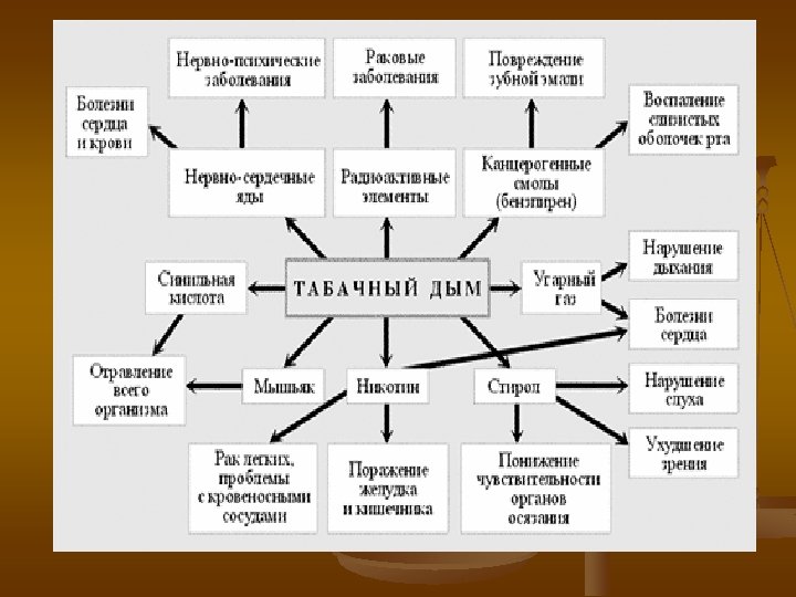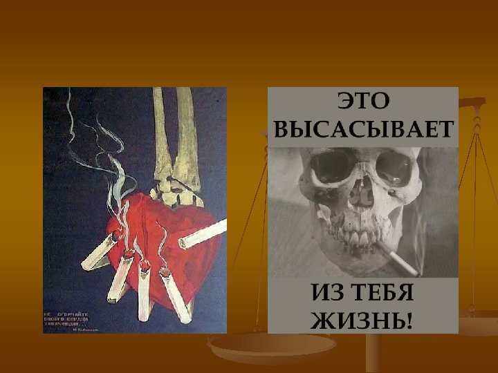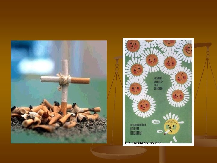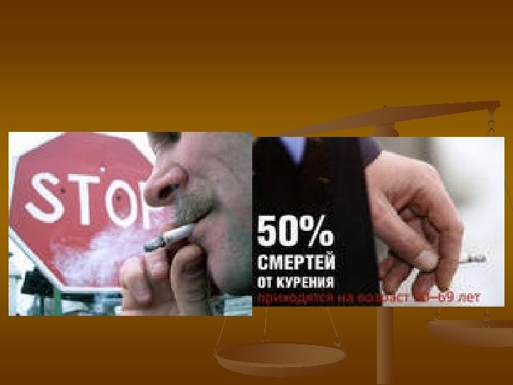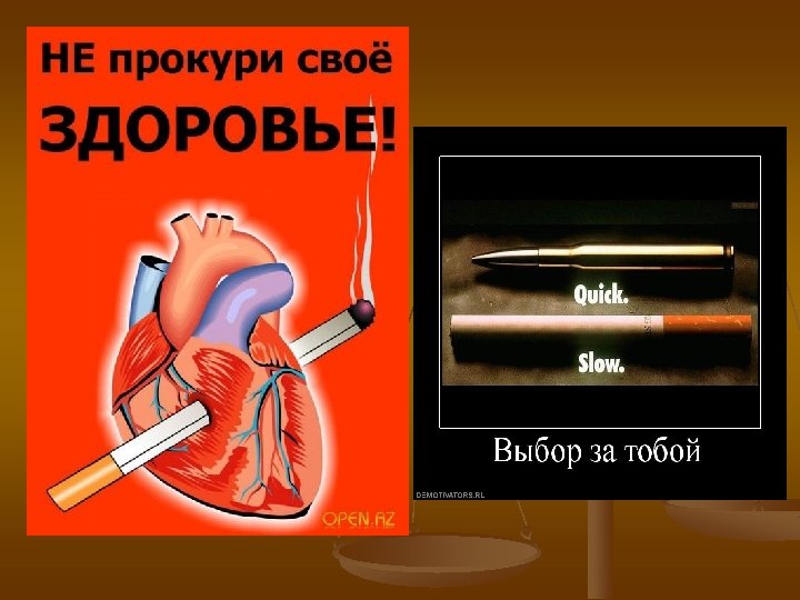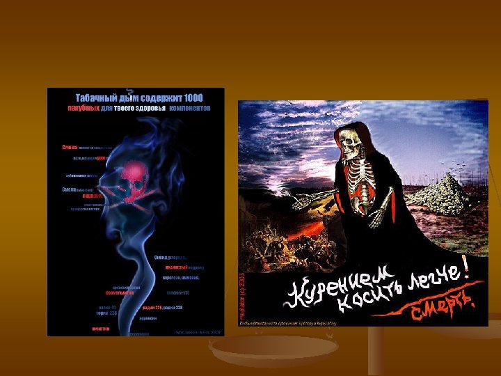 n К ним относятся: , (закупорка кровеносных сосудов – опасное осложнение), , , (у курящих никогда не развивается!). Также частота несколько ниже у курящих женщин, чем у некурящих. Но все-таки следует подчеркнуть, что эти второстепенные благоприятные эффекты не могут идти в сравнение с риском, обусловленным постоянным курением. Всем известно, что курение вызывает самые тяжелые формы болезней: Рак легких, гортани, полости рта, почек, поджелудочный железы, мочевого пузыря. Атеросклероз. Инфаркт миокарда. Язвенная болезнь желудка и двенадцатиперстной кишки. Хронический кариес. Туберкулез легких. Сахарный диабет. Кожные заболевания. Редкие формы слепоты. Список можно продолжать до бесконечности. Конечно же, эти заболевания встречаются и у некурящих людей. Но статистика показывает, что риск возникновения этих заболеваний у курящих в 10 раз больше! У 9 из 10 злостных курильщиков (выкуривающих от 2 пачек в день) случается инфаркт миокарда! n Многие некурящие подвергаются воздействию табачного дыма, так как вдыхают его дома, в общественных местах, в маршрутках, на работе, где находятся курящие. Это называется пассивным курением. Пассивное курение менее опасно для здоровья, но также может вызвать зависимость! По данным ВОЗ, от последствий хронического никотинового отравления ежегодно преждевременно расстаются с жизнью не менее 2500000 человек. Это число продолжает расти с каждым годом. Задумайтесь о здоровье. . . Каждая выкуренная сигарета может оказаться последней