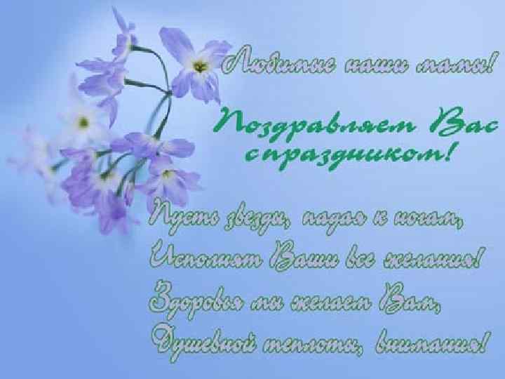 Только мамы нас любят не за что-то, а просто, Только лишь потому, что мы есть, мы живем, Только к мамам идем мы по важным вопросам, Только им свои беды, проблемы несем. Посвящаем мы мамам успехи, победы, А в День Матери, в праздник любви, Мы желаем, чтоб их миновали все беды, Чтоб их дети им только лишь счастье несли.