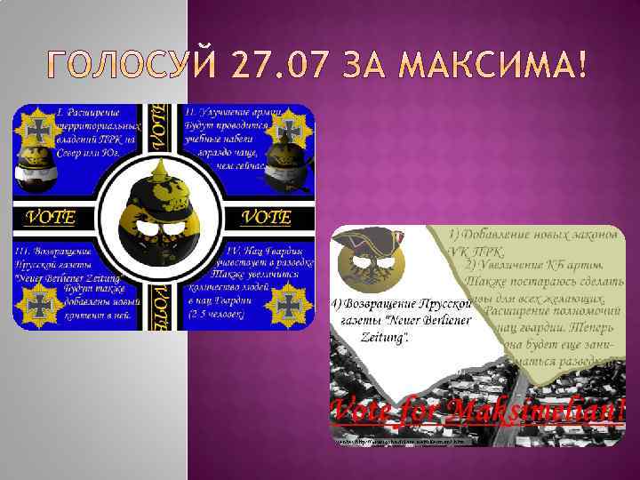 В последнее время я не мог делать газеты для Пруссии т. к я был в лагере и еще являлся президентом РФК, страны которую смог поднять с колен на новый уровень (с РП к КБ). Но теперь я смогу еженедельно выпускать газету “Neuer Berliener Zeitung”.