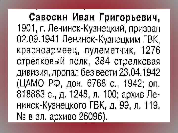 Савосин Иван Григорьевич (1901 г. р. ) Перед войной, жил в городе Лениск-Кузнецкий. Из рабочих. Работал плотником на лесопилке.