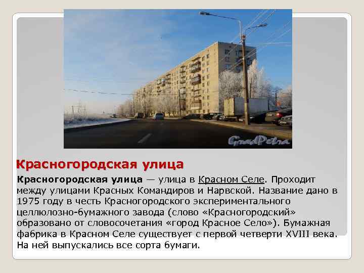 Красногородская улица — улица в Красном Селе. Проходит между улицами Красных Командиров и Нарвской. Название дано в 1975 году в честь Красногородского экспериментального целлюлозно-бумажного завода (слово «Красногородский» образовано от словосочетания «город Красное Село» ). Бумажная фабрика в Красном Селе существует с первой четверти XVIII века. На ней выпускались все сорта бумаги.