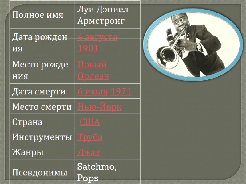 Л. Армстронг родился в бедности, дед был рабом, мать – прачкой. Начал играть на корнете с 14 лет, не зная нот. С 23 лет – лучший джазмен своего времени.