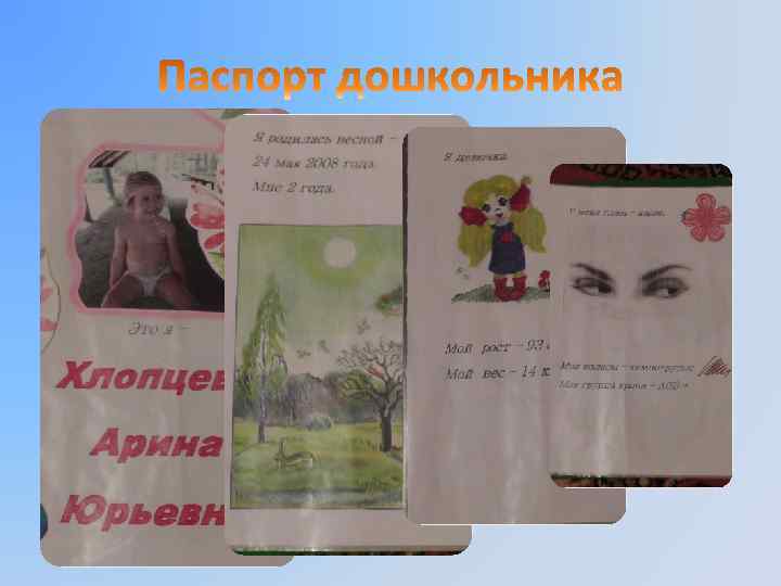 Цели проекта: - социально-личностное развитие детей; - развитие эмоциональной сферы детей; - создание условий для развития благоприятных отношений в семье и группе; - расширение представлений об обществе и стране; - знакомство семей группы через сообщения детей. Задачи проекта: - способствовать формированию представлений о паспорте: что такое паспорт, зачем он нужен, где необходим паспорт; - способствовать формированию представлений о происхождении и значении имени; - закреплять знание своего имени и фамилии, имен родителей и близких родственников, цвета глаз и волос; - формировать знание даты своего рождения (сезон); - воспитывать любовь к родному краю, городу, семье.