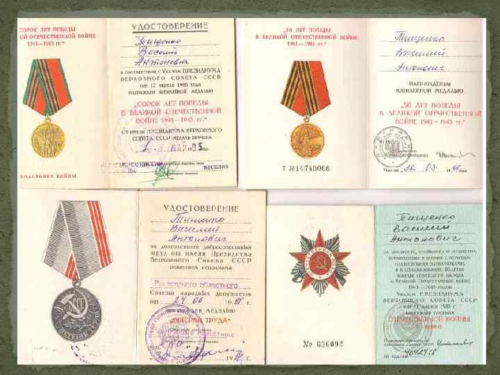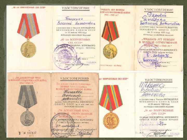 Моего прадедушку звали Тищенко Василий Антонович , по званию Рядовой. Родился в 1921 году. Их было 6 в семье. Три сестры : Зоя , Варвара , Анна , и три брата : Григорий , Кузьма и Василий. Перед тем, как уйти на фронт родители дали благословение написанное на бумаге каждому из сыновей, и все трое вернулись домой. Мой прадедушка был ранен, куда не сказал. Он рассказывал, что они рыли окопы, наливали по колено воды и прятались под водой от фашистов и танков. Мой дедушка был награждён медалями : Тридцать лет победы 1941 -1945 года, 70 лет Вооружённых сил СССР 19181988, 60 лет вооруженных сил СССР, за доблестный труд в Великой Отечественной войне 1941 -1945 года, 50 лет Великой Отечественной войне 1941 -1945 года