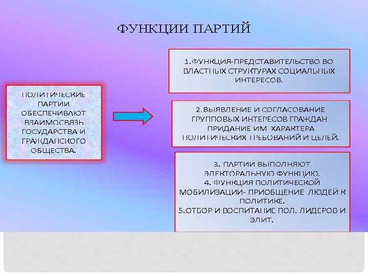 ПОЛИТИЧЕСКАЯ ПАРТИЯ Слово «партия» в переводе с латинского «partio» означает «дело» , «часть» . Политическая партия – это часть населения, класса, социально-политического слоя или слоев. Ее появление политологи относят к периоду становления буржуазной демократии. Однако в конституциях государств статья о партиях появилась лишь в XX веке. Партии выполняют роль посредников между группами населения и государственной властью, обеспечивая сопряжение и учет их интересов в деятельности политических институтов. Партия – это важнейший социально-политический институт, посредством которого осуществляется взаимосвязь гражданского общества и государства.