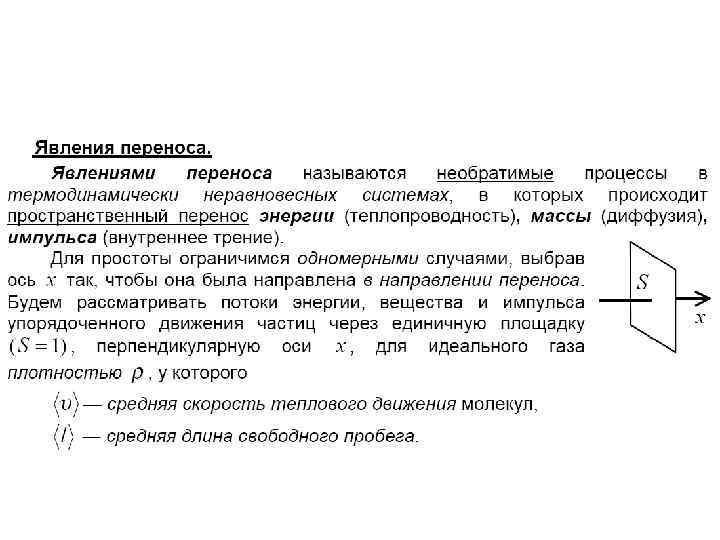 Явления переноса • В термодинамически неравновесных системах возникают особые необратимые процессы, называемые явлениями переноса, в результате которых происходит пространственный перенос энергии, массы, импульса. • К явлениям переноса относятся • теплопроводность (обусловлена переносом энергии), • диффузия (обусловлена переносом массы) • внутреннее трение (обусловлено переносом импульса). • Для простоты ограничимся одномерными явлениями переноса. Систему отсчета будем выбирать так, чтобы ось х была ориентирована в направлении