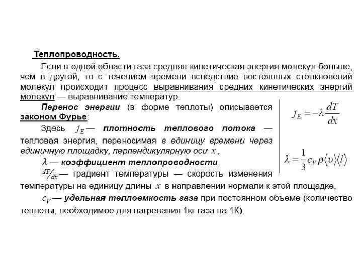 Теплопроводность • Можно показать, что • где — удельная теплоемкость газа при постоянном объеме (количество теплоты, необходимое для нагревания 1 кг газа на 1 К при постоянном объеме), • — плотность газа, —средняя скорость теплового движения молекул, — средняя длина свободного пробега.