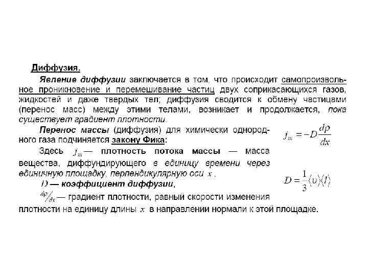 Закон Фика • Явление диффузии для химически однородного газа подчиняется закону Фика: • где плотность потока массы величина, определяемая массой вещества, диффундирующего в единицу времени через единичную площадку, перпендикулярную оси х, D — диффузия (коэффициент диффузии), градиент плотности, равный скорости изменения плотности на единицу длины х в направлении нормали к этой площадке. Знак минус показывает, что перенос массы происходит в направлении убывания плотности (поэтому знаки и противоположны). • Диффузия D численно равна плотности потока массы при градиенте плотности, равном единице. Согласно кинетической теории газов, •