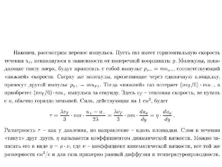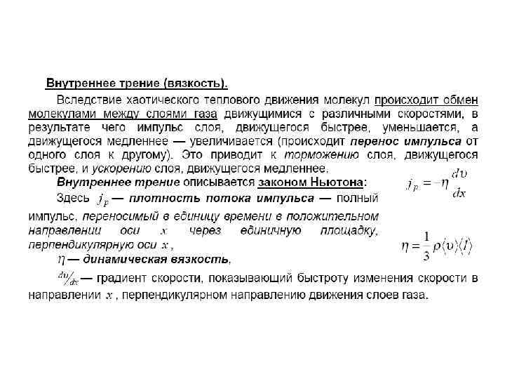 Внутреннее трение (вязкость) • Взаимодействие двух слоев согласно второму закону Ньютона можно рассматривать как процесс, при котором от одного слоя к другому в единицу времени передастся импульс, по модулю равный действующей силе. Тогда выражение можно представить в виде • где плотность потока импульса — величина, определяемая полным импульсом, переносимым в единицу времени в положительном направлении оси х через единичную площадку, перпендикулярную оси x • - градиент скорости. Знак минус указывает, что импульс переносится в направлении убывания скорости (поэтому • знаки и противоположны).