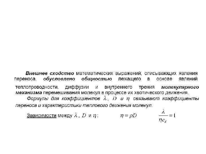 Связь между коэффициентами • Рассмотренные законы Фурье, Фика и Ньютона не вскрывают молекулярнокинетического смысла коэффициентов. Выражения для коэффициентов переноса выводятся из кинетической теории. • Формулы связывают коэффициенты переноса и характеристики теплового движения молекул. Из этих формул вытекают простые зависимости между • Используя эти формулы, можно по найденным из опыта одним величинам определить другие.