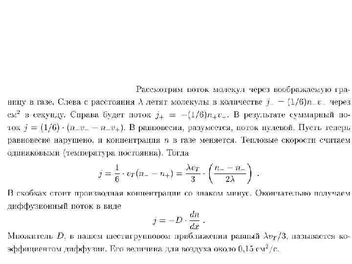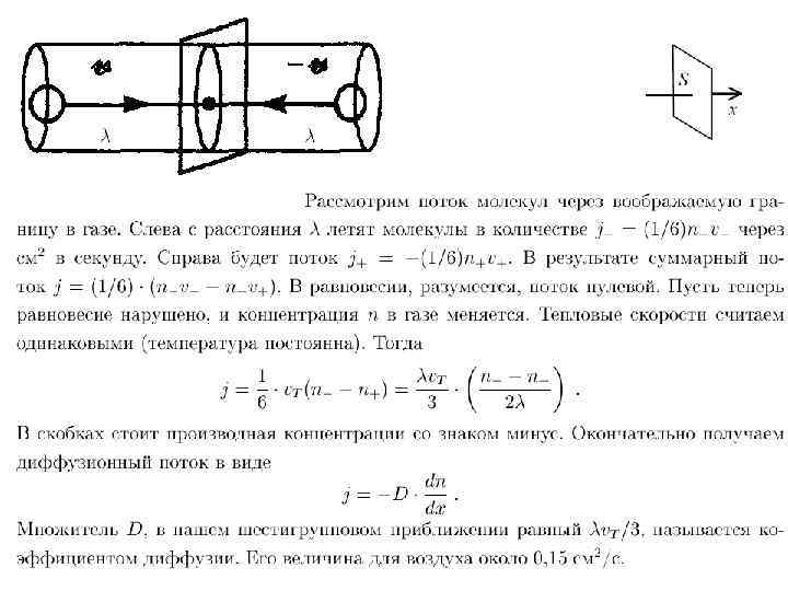 • При получении формулы для полного потока это выражение нужно умножить на число частиц — носителей величины G, которые в состоянии пересечь в единицу времени единичную площадку, перпендикулярную оси X. Число таких частиц равно числу частиц, движущихся параллельно оси X и отстоящих от указанной площадки на расстояние, не большее длины свободного пробега , т. е. заключенных в объеме, основание которого единица, а длина равна 2. Число частиц в единице объема, движущихся в направлении оси X, равно n/6 и (ввиду равновероятности движения в любом из возможных шести направлений). Полный поток величины G равен