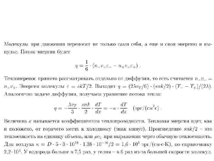 Теплопроводность • Пусть системе сообщено некоторое количество тепла. При этом некоторая часть системы оказывается более нагретой, откуда тепло посредством столкновений распространяется по всему объему, т. е. возникает поток тепла. Переносимая физическая величина в этом случае — тепло, значит G = Q. Поскольку количество тепла характеризуется температурой Q = CVT , где СV — теплоемкость вещества, то, подставляя вместо G в общую формулу • это выражение, получим: • Следовательно, поток тепла пропорционален градиенту температуры. • Величина ‑ коэффициент теплопроводности.