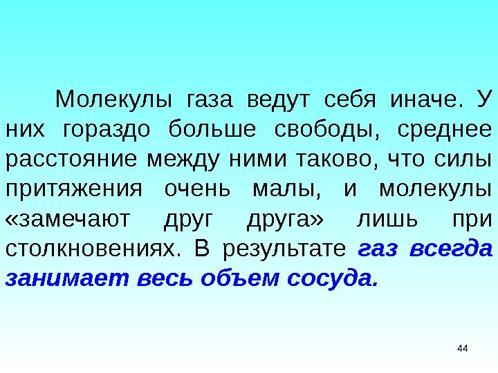 Молекулы газа ведут себя иначе. У них гораздо больше свободы, среднее расстояние между ними таково, что силы притяжения очень малы, и молекулы «замечают друга» лишь при столкновениях. В результате газ всегда занимает весь объем сосуда.