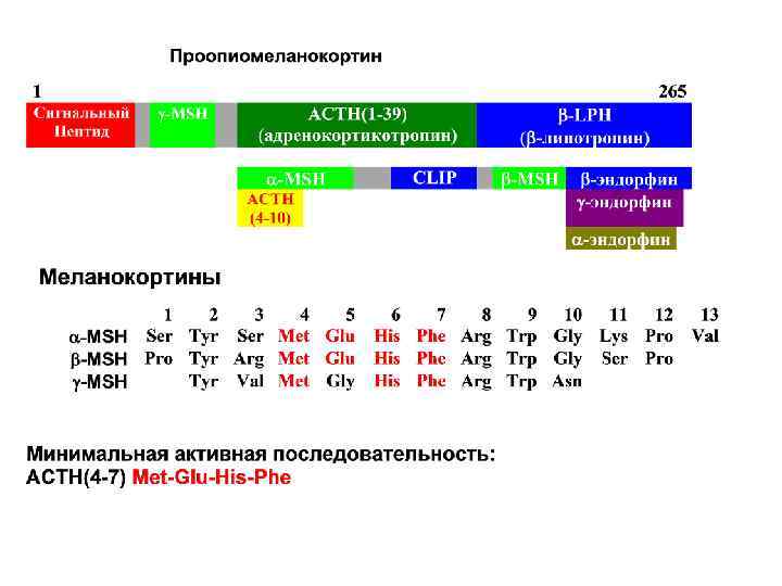 МЕЛАНОКОРТИНОВЫЕ РЕЦЕПТОРЫ ( МС-R ) ( связаны с G-белками ) МС-R 1 МС-R 2 МС-R 3 МС-R 4 МС-R 5 315 (317)а. а. 297 а. а. 323 (361)а. а. 333 а. а. 325 а. а. Меланома (мозг, гипофиз, семенники) Надпочечники (жировая ткань, кожа) Мозг, (желудок, Поджелудочная железа, плацента) Мозг, кожа, Мышцы, Селезенка, яичники, семенники, надпочечники Пигментация Кожи, Воспаление Стероидогенез ? (нейропротек -ция, регенерация) Потребление пищи (вес тела), болевая чувствительность, (нейропротек -ция) ? регенерация мышц и нервов (нейропротекция) a-MSH Kd – 0. 12 n. M ACTH Kd – 0. 1 n. M g, b-MSH, a-MSH Kd – 7 -13 n. M a-MSH, b-MSH Kd – 70 -380 n. M a-MSH, b-MSH Kd – 10 -70 n. M Гомология внутри семейства от 40 до 70% (аминокислотная последовательность) Вторичные мессенджеры: DAG/ITP ( Ca 2+ ), c. AMP