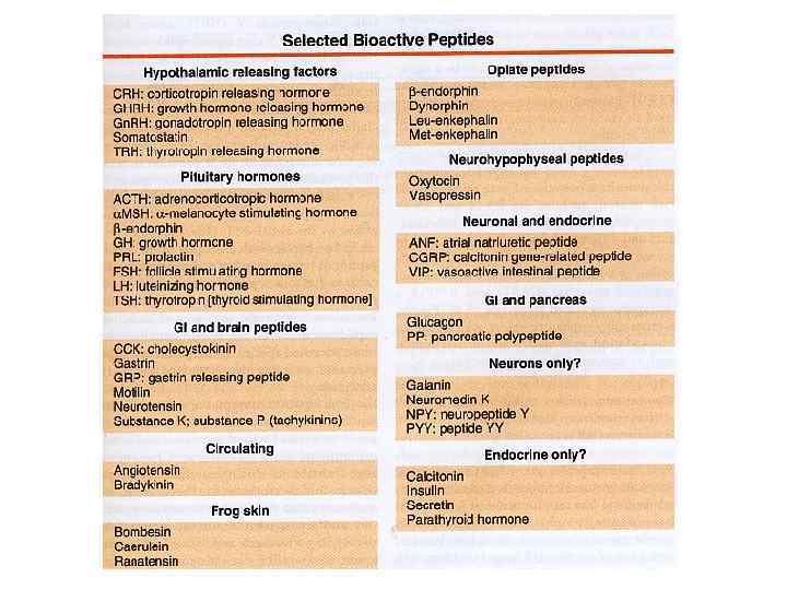 Регуляторные пептиды (нейропептиды в мозге) ответственны за так называемую медленную синаптическую передачу в отличие от классических Нейротрансмиттеров (АХ, глутамата и тд). Действие нейропептидов осуществляется в основном через рецепторы, ассоциированные с G-белками В отличие от классических нейротрансмиттеров нейропептиды синтезируются на рибосомах в теле клетки и транспортируются в нервные окончания в виде везикул Пока одно исключение: FMRF-amide напрямую активирует амилорид-чувствительный Натриевый ионный канал