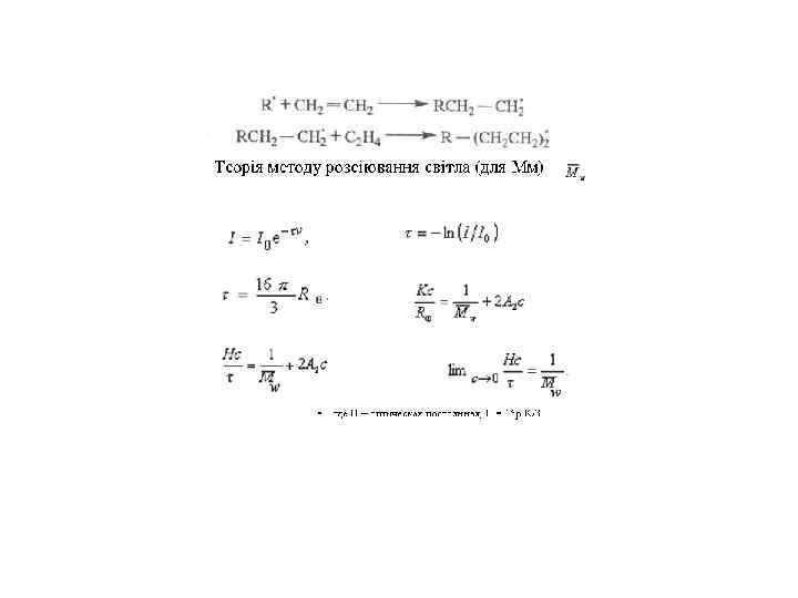 Метод розсіювання світла • Для розрахунку Мм використовують рівняння Дебая • для розрахунку Мм потрібно виміряти кутове розсіювання світла, коефіцієнт заломлення середовища • с – масова концентрація, г/см 3; K – оптична постійна, залежна від коефиіціента заломлення середовища (n 0), концентраційного інкремента коефіциєнта заломлення розчину (dn/dc) і довжини хвилі світла