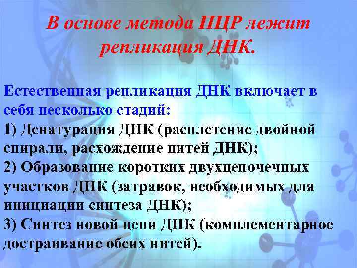 В основе метода ПЦР лежит репликация ДНК. Естественная репликация ДНК включает в себя несколько стадий: 1) Денатурация ДНК (расплетение двойной спирали, расхождение нитей ДНК); 2) Образование коротких двухцепочечных участков ДНК (затравок, необходимых для инициации синтеза ДНК); 3) Синтез новой цепи ДНК (комплементарное достраивание обеих нитей).