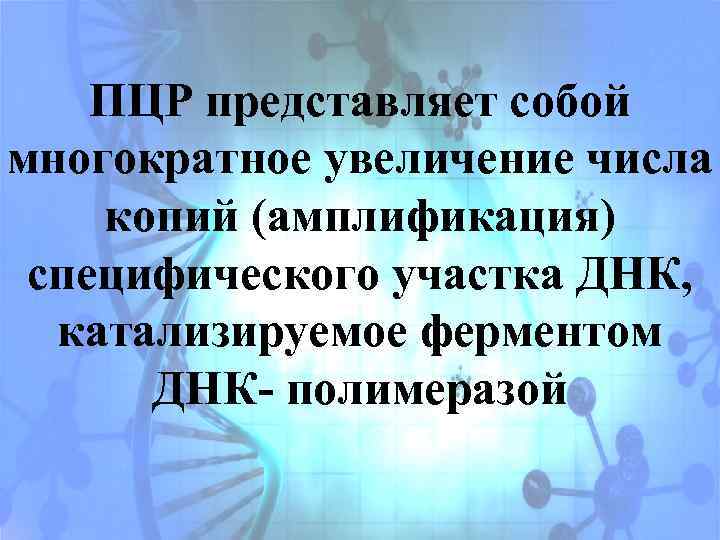 ПЦР представляет собой многократное увеличение числа копий (амплификация) специфического участка ДНК, катализируемое ферментом ДНК- полимеразой