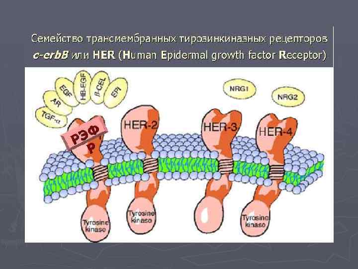 Что такое HER 2/neu ? (H uman E pidermal growth factor R eceptor 2) Ø Представитель семейства трансмембранных тирозинкиназных рецепторов, продуктов онкогенов группы cerb. B, в которое входит РЭФР, - одной из важнейших систем передачи митогенного сигнала. Ø Уникальный рецептор-диспетчер, который, не имея собственного лиганда, образует наиболее функционально активные димеры с другими рецепторами своего семейства и усиливает их эффекты.