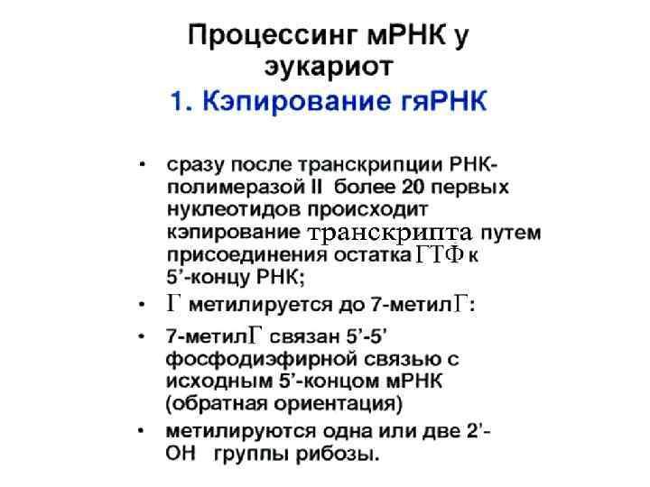 Кэпирование м. РНК у эукариот n n Сразу после транскрипции РНК-полимеразой II более 20 первых нуклеотидов происходит кэпирование транскрипта путём присоединения метилированного гуанилового нуклеотида к 5‘концу РНК. Нуклеотид связывается 5‘-5‘ фосфодиэфирной связью с исходным 5‘концом м. РНК (обратная ориентация)