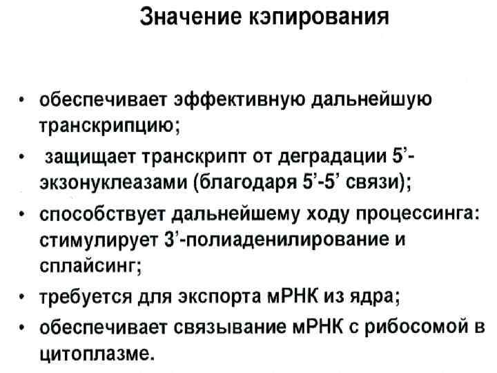Процессинг РНК n n n Формирование зрелых молекул м. РНК из первичных транскриптов (пре-РНК) получило название – процессинг РНК. Процессинг РНК складывается из трёх отдельных процессов: 1. Кэпирование 5‘-конца 2. Полиаденилирование 3‘-конца 3. Сплайсинг