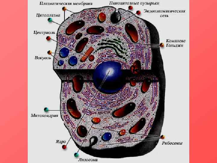 1 – ядрышко; 2 – ядро; 3 – рибосомы; 4 – везикула; 5 – гранулярный эндоплазматический ретикулум; 6 – аппарат Гольджи; 7 – цитоскелет; 8 – гладкий эндоплазматический ретикулум; 9 – митохондрии; 10 – вакуоль; 11 – цитоплазма; 12 – лизосома; 13 – центриоли
