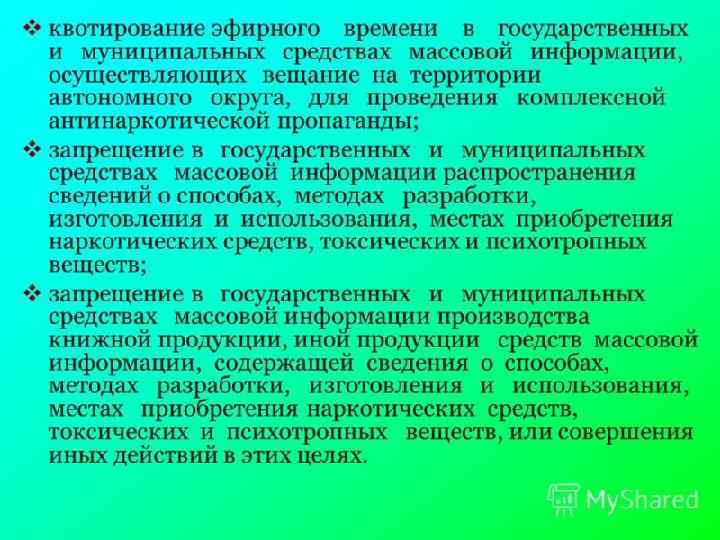 • Основные наркотики, которые бытуют в России, растительного происхождения, их выращивают крестьяне в Средней Азии, на Дальнем Востоке, в Сибири и других регионах. И в России под наркотиками сегодня около 1 млн. гектаров. И это не вина этих людей - это их беда, потому, что это в основном люди престарелого возраста, инвалиды, пенсионеры, у них нет другого способа прокормить свои семьи. Многие, особенно в отдаленных, высокогорных районах, живут только за счет этого. В этих местах наркотики - это деньги, которыми расплачиваются, меняют на товары, продукты. Это не бизнес для них, это способ выжить. И Вообще в борьбе с наркоманией наибольшего успеха, как ни странно, добились Сингапур и Малайзия, где за все операции, связанные с наркотиками - смертная казнь.