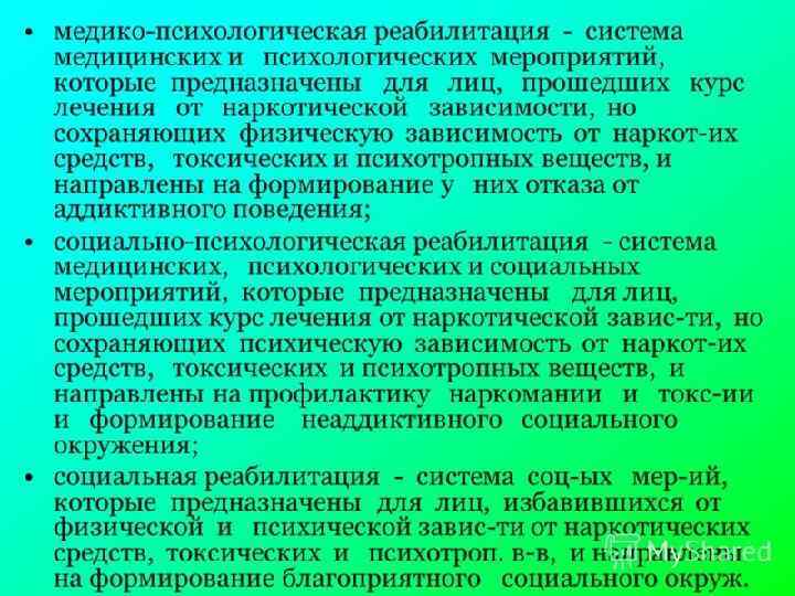 • В литературе описано два типа такого поведения: • - полисубстантное (применение широкого спектра психот • • • ропных и токсических веществ, среди которых затем выбирается наиболее привлекательное); - моносубстантное (применение только одного вещества, к которому имеется наилучший доступ). Риск возникновения и развития наркоманий при наличии аддитивного поведения (АП) по данным литературы колеблется в широких пределах (для опиатов это составляет от 19 до 42%). Факторы риска можно разделить на три наиболее значимых и основных группы: - социальные факторы - доступность вещества (или препарата); мода на него; влияние группы сверстников (самый значимый фактор); - психологические факторы - личностный характер человека; привлекательность испытываемых ощущений и переживаний; - биологические факторы - изначальная толерантность; пути и природа употребляемого вещества (препарата).