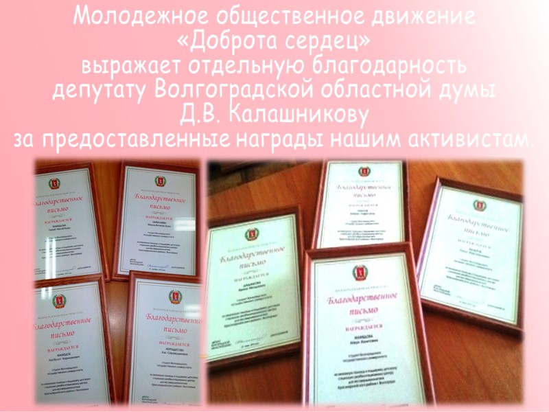 Молодежное общественное движение «Доброта сердец» выражает отдельную благодарность депутату Волгоградской областной думы Д.В. Калашникову за предоставленные награды нашим активистам.