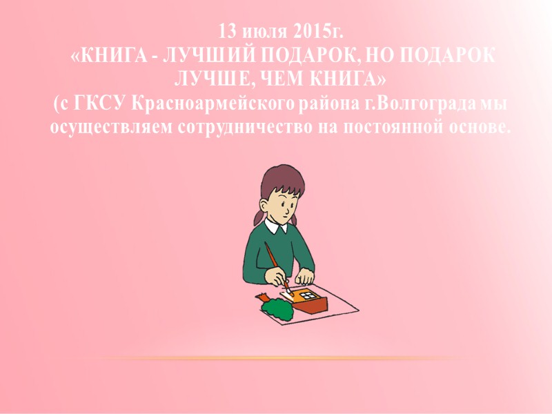 13 июля 2015г. «КНИГА - ЛУЧШИЙ ПОДАРОК, НО ПОДАРОК ЛУЧШЕ, ЧЕМ КНИГА» (с ГКСУ Красноармейского района г.Волгограда мы осуществляем сотрудничество на постоянной основе.