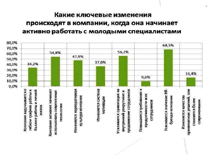 Для молодого специалиста 24 -35 лет выделяются такие мотиваторы: В компании присутствует перспектива роста, развития карьеры (вертикальной, горизонтальной и ускоренной, центростремительной) В компании организовано системное корпоративное обучение, а также поощряется бизнес-образование в престижных учебных центрах В компании созданы условия для расширения профессиональных знаний и опыта При получении опыта завершения успешных проектов в компании созданы возможности влиять на политику компании В компании можно удовлетворить интерес к инновациям и новым методам работы В коммуникациях с коллегами можно реализовать стремление к расширению жизненного опыта