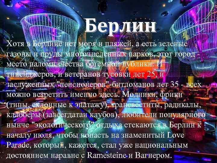 Берлин Хотя в Берлине нет моря и пляжей, а есть зеленые • Хотя в Берлине нет моря и пляжей, а есть зеленые газоны и пруды многочисленных парков, этот город - место паломничества богемной публики. И тинейджеров, и ветеранов тусовки лет 25, и заслуженных "пенсионеров"-битломанов лет 35 - всех можно встретить именно здесь. Модники, фрики (типы, склонные к эпатажу), трансвеститы, радикалы, клабберы (завсегдатаи клубов), любители популярного нынче "экологического" отдыха клабберы (завсегдатаи клубов), любители популярного стекаются в Берлин к началу июля, чтобы попасть на нынче "экологического" отдыха стекаются в Берлин к знаменитый Love Parade, который, кажется, стал уже началу июля, чтобы попасть на знаменитый Love национальным достоянием наравне с Ramesteine и Вагнером. Parade, который, кажется, стал уже национальным достоянием наравне с Ramesteine и Вагнером.