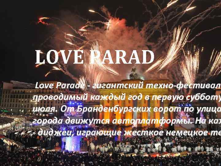 Love Parade LOVE PARAD Love Parade - гигантский техно -фестиваль, проводимый каждый год в первую субботу Love Parade - гигантский техно-фестивал июля. От Бранденбургских техно-фестиваль проводимый каждый год ворот по улицам города в первую субботу движутся автоплатформы. На ворот по улица июля. От Бранденбургских каждой - диджеи, играющие города движутся автоплатформы. На каж жесткое немецкое техно. - диджеи, играющие жесткое немецкое те