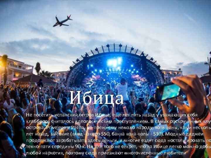 Ибица Не посетить испанский остров Ибица, еще лет пять назад у уважающих себя клабберов считалось идеологическим преступлением. В самых раскрученных клуб острова, Privelege и Pacha, по-прежнему немало народу, хотя цены, как и нескольк лет назад, высокие (вход - около $50, банка кока-колы - $10). Модные диджеи продолжают зарабатывать здесь деньги, и многие ездят сюда ностальгировать по техно-пати середины 90 -х. Ни для кого не секрет, что на Ибице легко можно добы любой наркотик, поэтому сюда приезжают многочисленные любители
