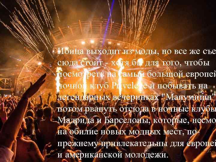Ибица выходит из моды, но все же съе сюда стоит - хотя бы для того, чтобы посмотреть на самый большой европей ночной клуб Privelege и побывать на легендарных вечеринках "Манумишн". потом рвануть отсюда в ночные клубы Мадрида и Барселоны, которые, несмо на обилие новых модных мест, попрежнему привлекательны для европей и американской молодежи.