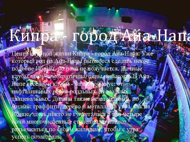 Кипра - город Айа-Напа Центр клубной жизни Кипра - город Айа-Напа. Уже который год из Айа-Напы пытаются сделать некое подобие Ибицы, но пока не получается. Ночные клубы здесь демократичны, цены невысоки. В Айа. Напе весело, и клубы - на любой вкус: от нафталиновых рок-н-ролльных, до модных танцевальных. Дизайн также незатейливый, но милый: граффити, дерево и металл. До утра, как на Ибице, здесь никто не гуляет: часа в три-четыре ночи многочисленные студенты начинают разъезжаться по своим жилищам, чтобы с утра успеть позагорать.