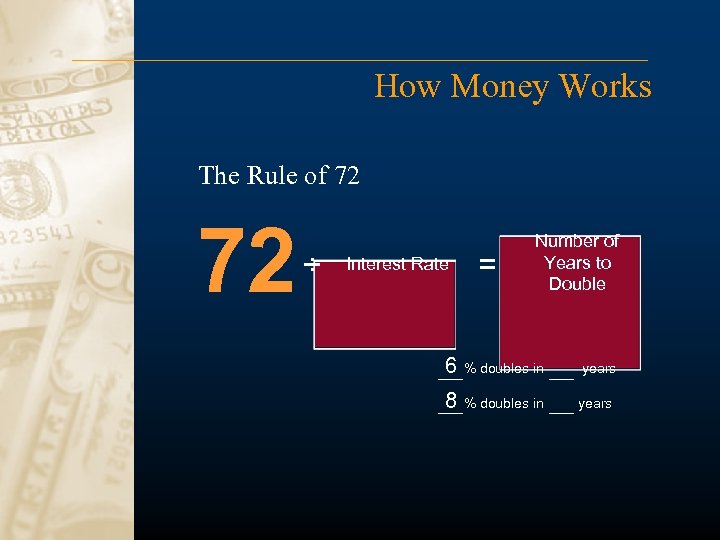 How Money Works The Rule of 72 72 ÷ Interest Rate = Number of Years to Double 6 % doubles in years 8 % doubles in years