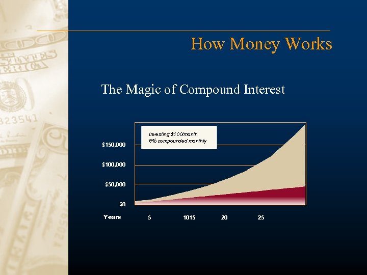 How Money Works The Magic of Compound Interest $150, 000 Investing $100/month 8% compounded monthly $100, 000 $50, 000 $0 Years 5 1015 20 25