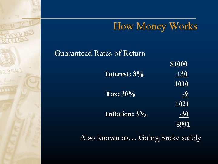 How Money Works Guaranteed Rates of Return Interest: 3% Tax: 30% Inflation: 3% $1000 +30 1030 -9 1021 -30 $991 Also known as… Going broke safely