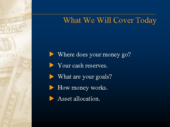 What We Will Cover Today Where does your money go? Your cash reserves. What are your goals? How money works. Asset allocation.