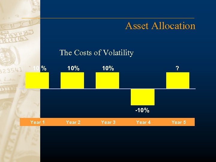 Asset Allocation The Costs of Volatility 10 % 10% ? -10% Year 1 Year 2 Year 3 Year 4 Year 5