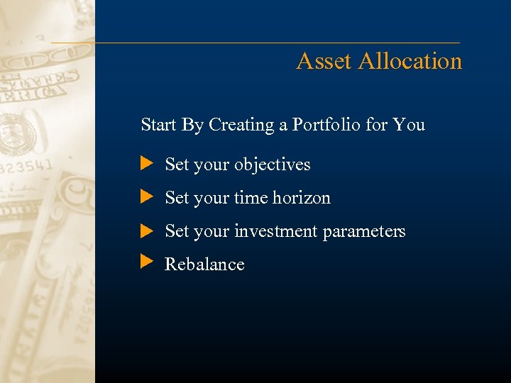 Asset Allocation Start By Creating a Portfolio for You Set your objectives Set your time horizon Set your investment parameters Rebalance