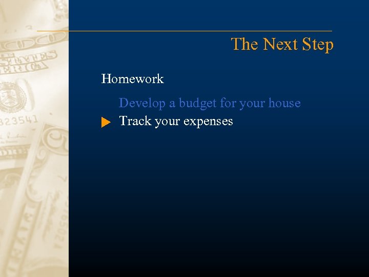 The Next Step Homework Develop a budget for your house Track your expenses Calculate monthly spending percentages Come up with a financial plan Have sufficient reserves