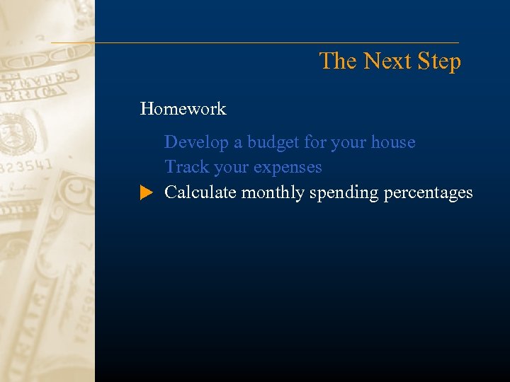 The Next Step Homework Develop a budget for your house Track your expenses Calculate monthly spending percentages Come up with a financial plan